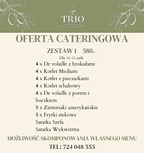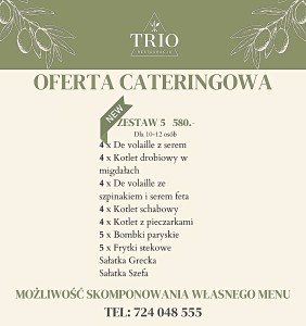 Zadatek za catering w wysokości 50% można zapłacić w restauracji, przelewem lub telefonicznie podając kod Blik. Brak zadatku skutkować będzie brakiem realizacji zamówienia.
